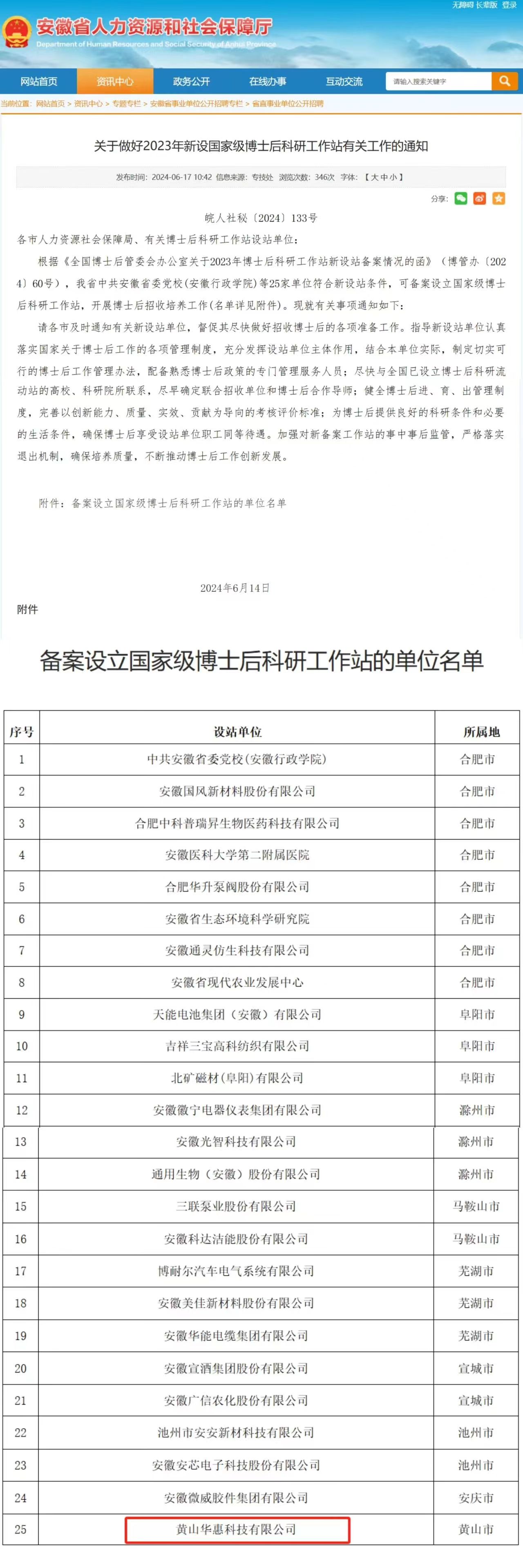 近日,安徽省人社廳發(fā)布《關(guān)于做好2023年新設(shè)國(guó)家級(jí)博士后科研工作站有關(guān)工作的通知》,25家單位符合新設(shè)站條件,可備案設(shè)立國(guó)家級(jí)博士后科研工作站,開(kāi)展博士后招收培養(yǎng)工作。其中,黃山華惠科技有限公司為該批次黃山市唯一一家獲備案企業(yè)。