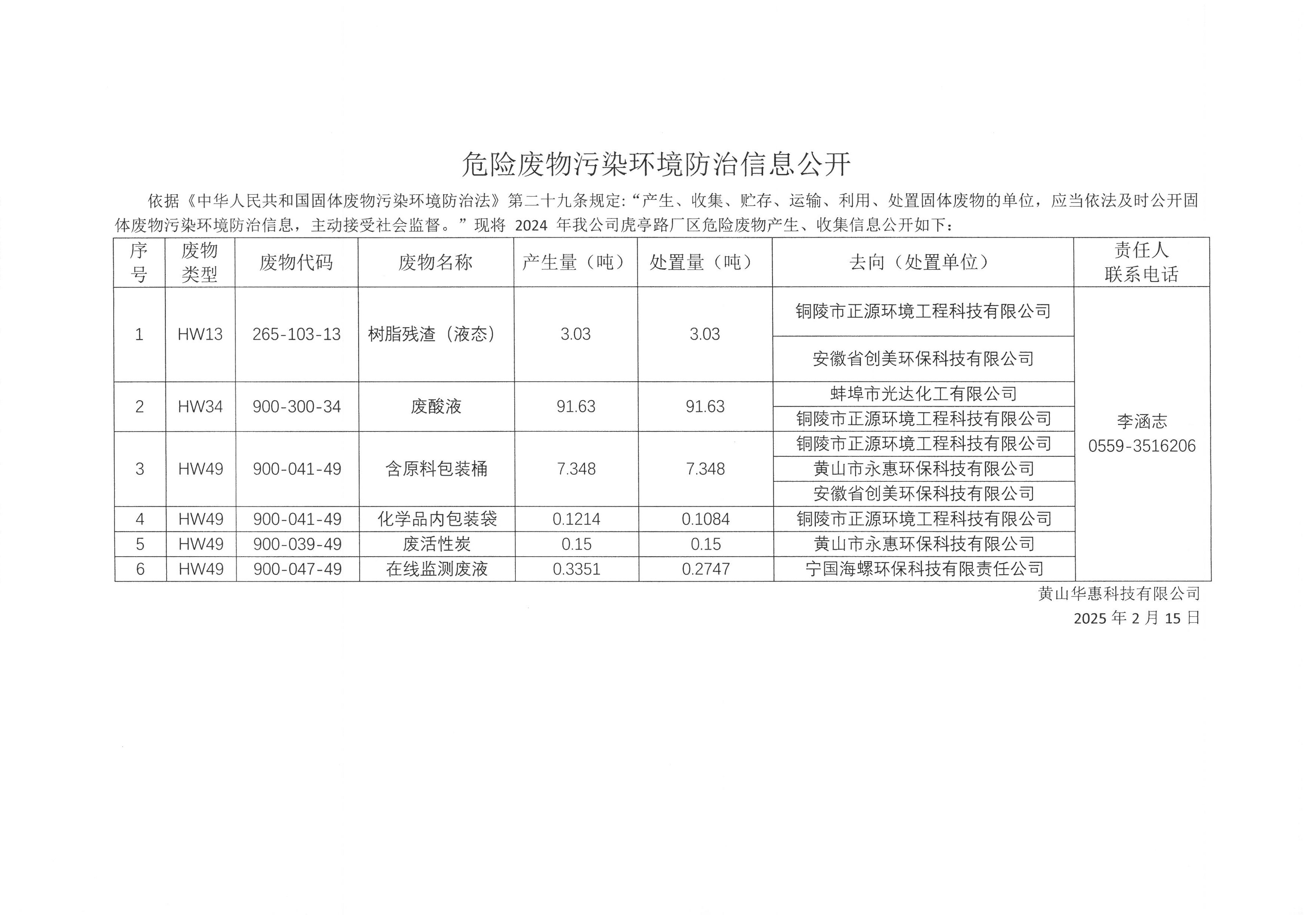 黃山華惠科技有限公司危險廢物污染防治信息公示